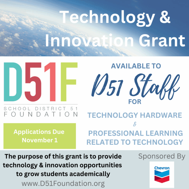 The 3rd Round of Technology & Innovation Grants from the D51 Foundation is now open! Mesa County Valley School District 51 staff may apply for these grants to purchase techn