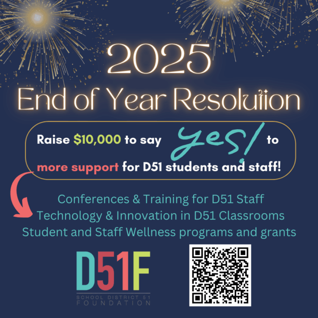 The D51 Foundation (D51F) raises money to support our local schools, prioritizing funding for professional learning, technology and innovation, and staff and student wellness. Our mission is to raise funds for academic growth and achievement and promote outreach to benefit kids and our community.