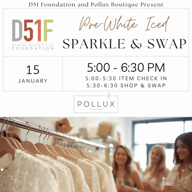 Get ready to refresh your White Iced wardrobe in style! Join us at Pollux Boutique on January 15 from 5:00-6:30 for a special Sparkle & Swap Event celebrating the D51 Foundatio