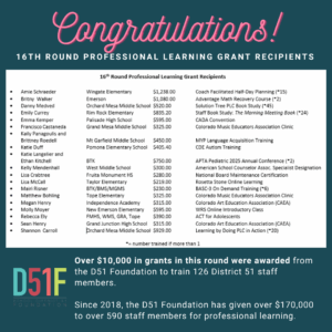 The District 51 Foundation is pleased to announce its 16th round of Professional Learning Grant Award Recipients. A total of more than $10,000 in grants will be awarded from the D51 Foundation to train 126 District 51 staff members. The foundation received grant requests totaling over $43,000. Since 2018, the D51 Foundation has donated over $170,000 to 590 D51 staff members for professional learning.